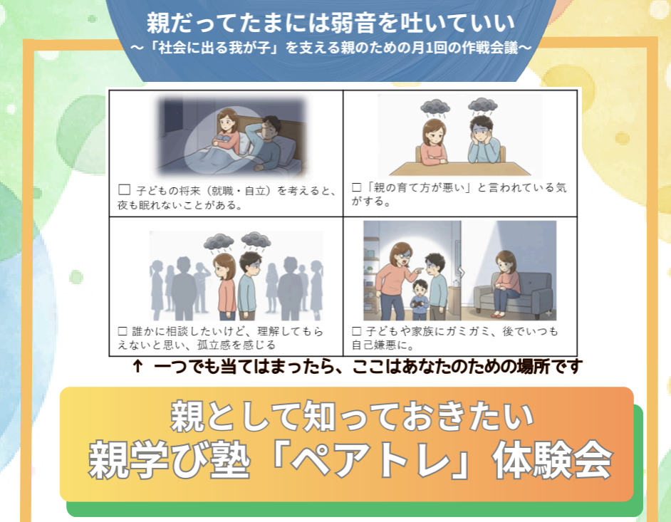 【参加者募集】 「私が楽しむなんて…」という罪悪感を手放しませんか? 親の笑顔が、子どもの自立を加速させる理由|親学び塾「ペアトレ」体験会