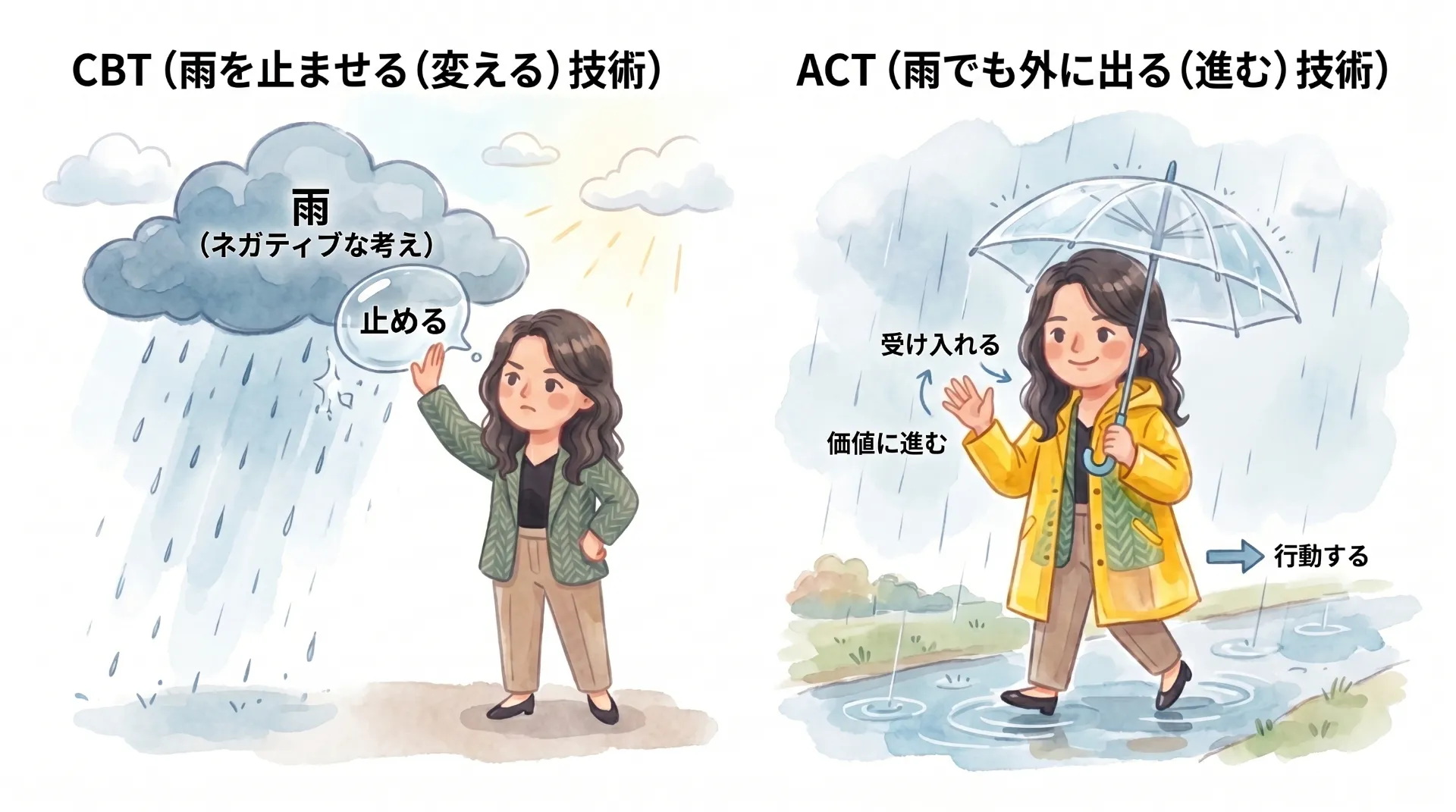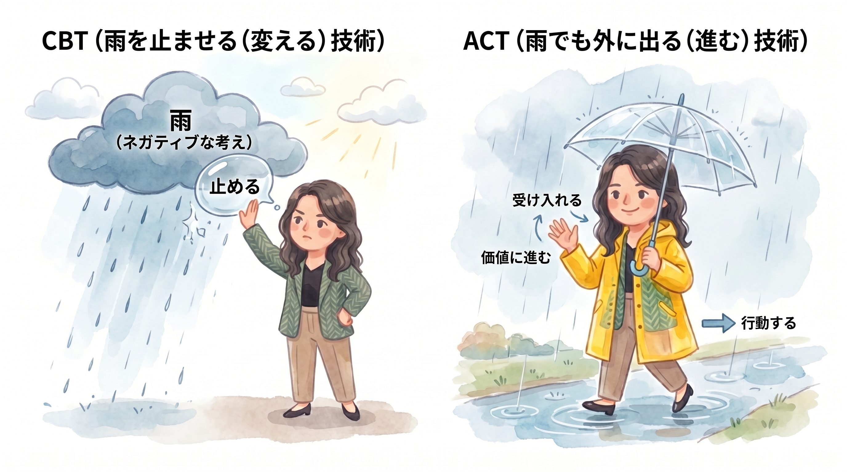 ただ、CBTとACTのどちらが優れているか?の話しではなく「感情や思考(心の天気)の扱い方の違いだけなんです。どちらもある方が、いろいろな状況に対応しやすくなるという話しなんです。
