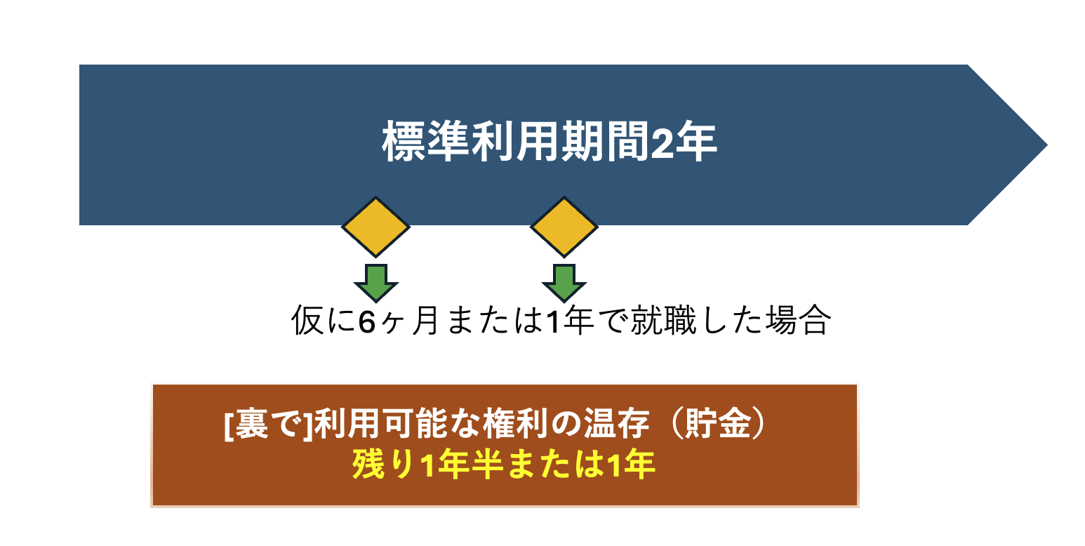 就労移行支援には「原則2年以内」というルールがありますが、これは逆に言えば、短期間で就職が決まった場合、万が一離職してしまっても、原則、残りの期間を使って、何度でも就労移行支援に戻ってやり直せるということです。